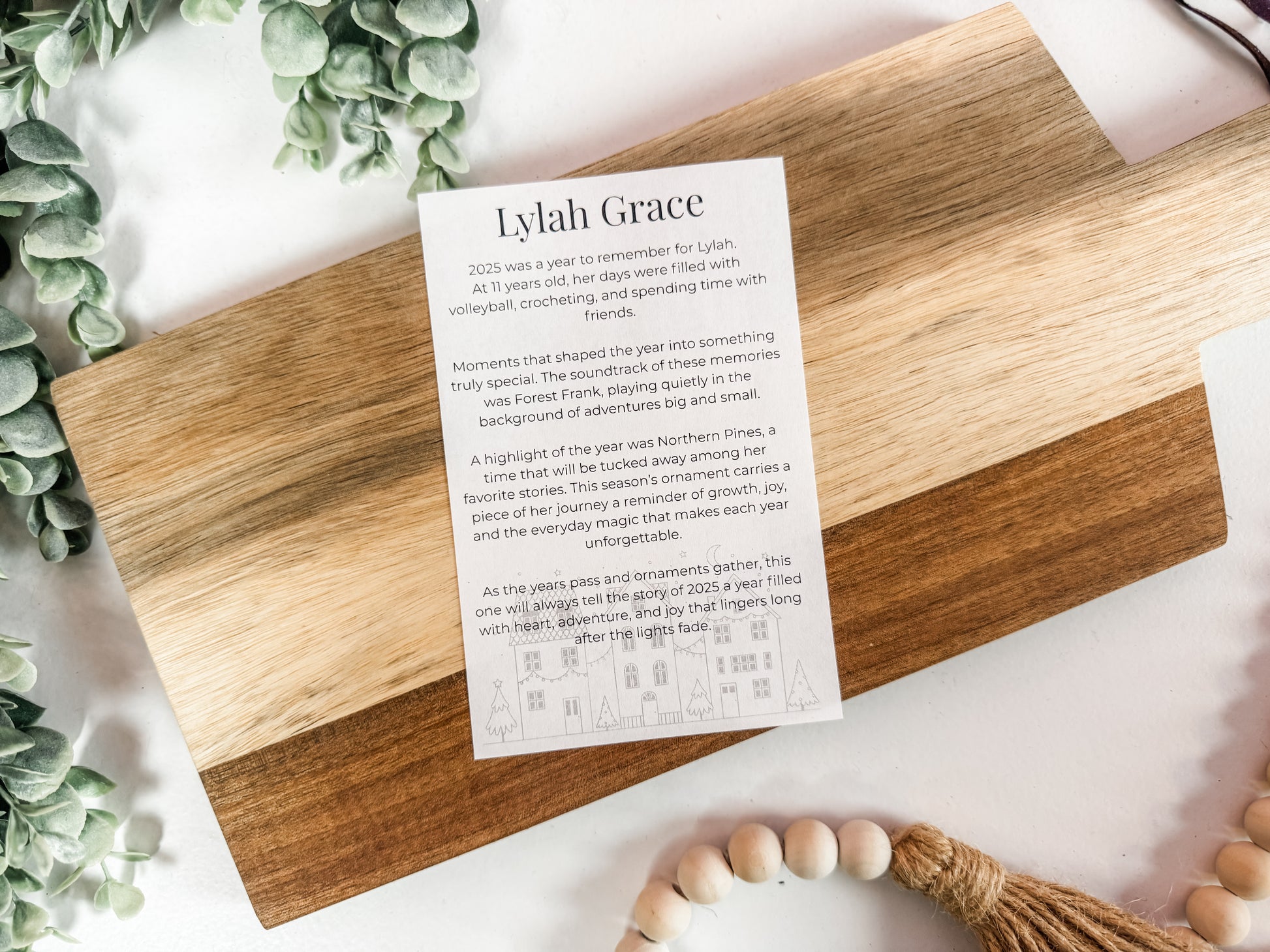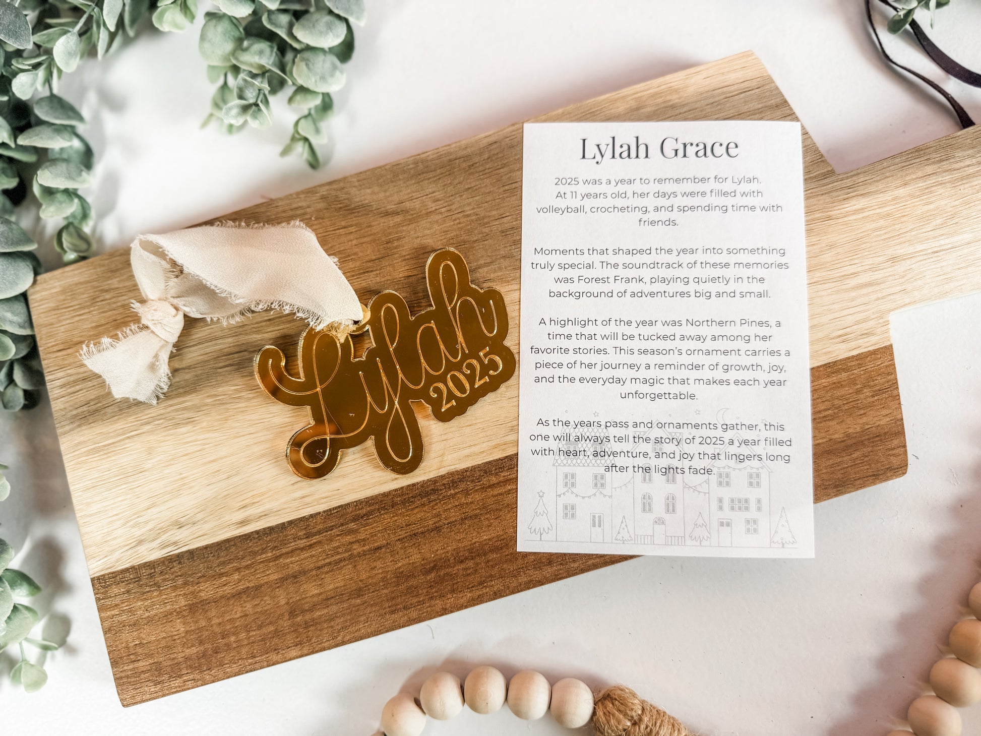 Our 2025 “Story of the Year” Ornament combines elegant engraved mirrored acrylic with a custom printed story card, creating a heartfelt way to celebrate your child’s year.
