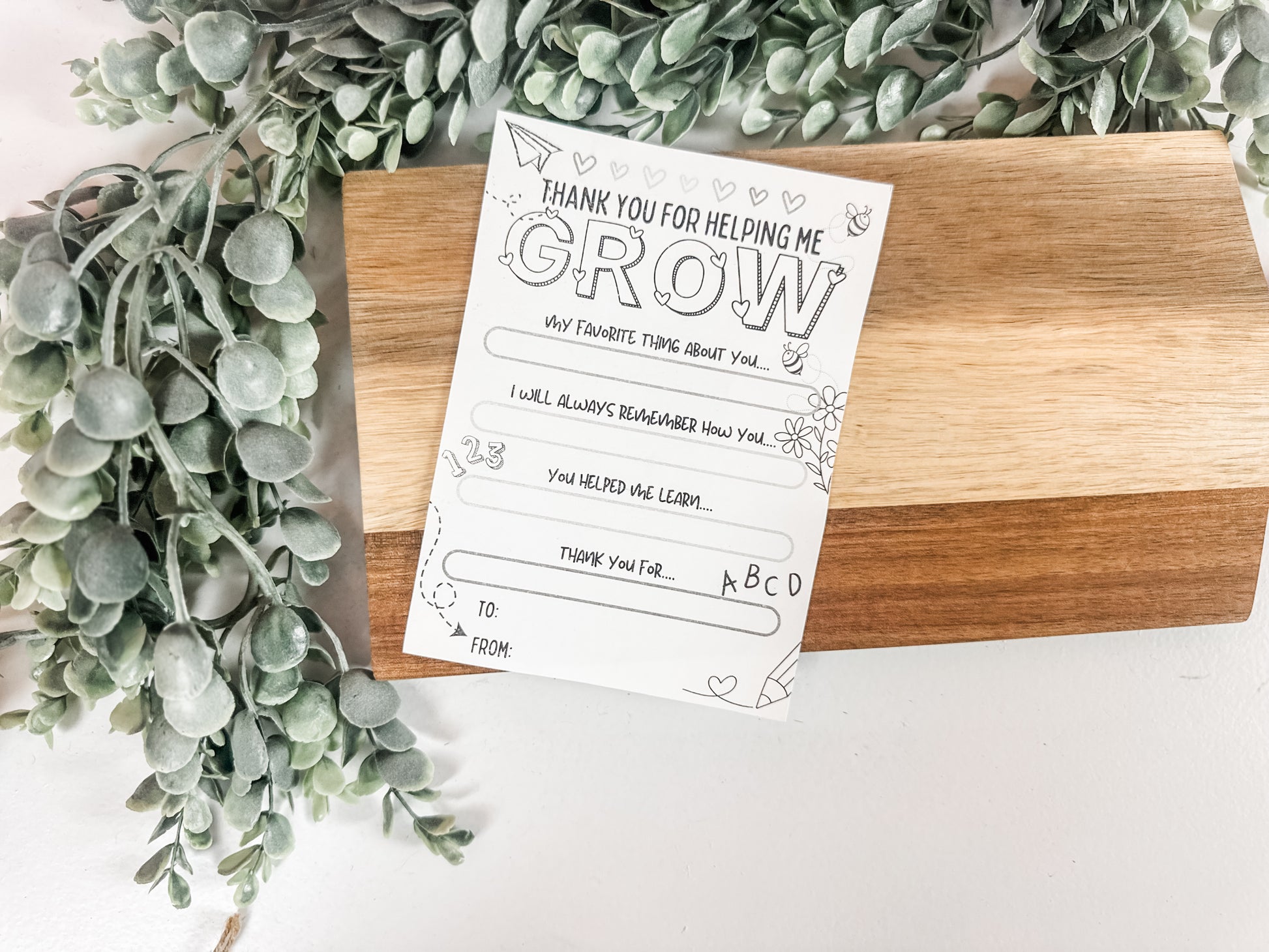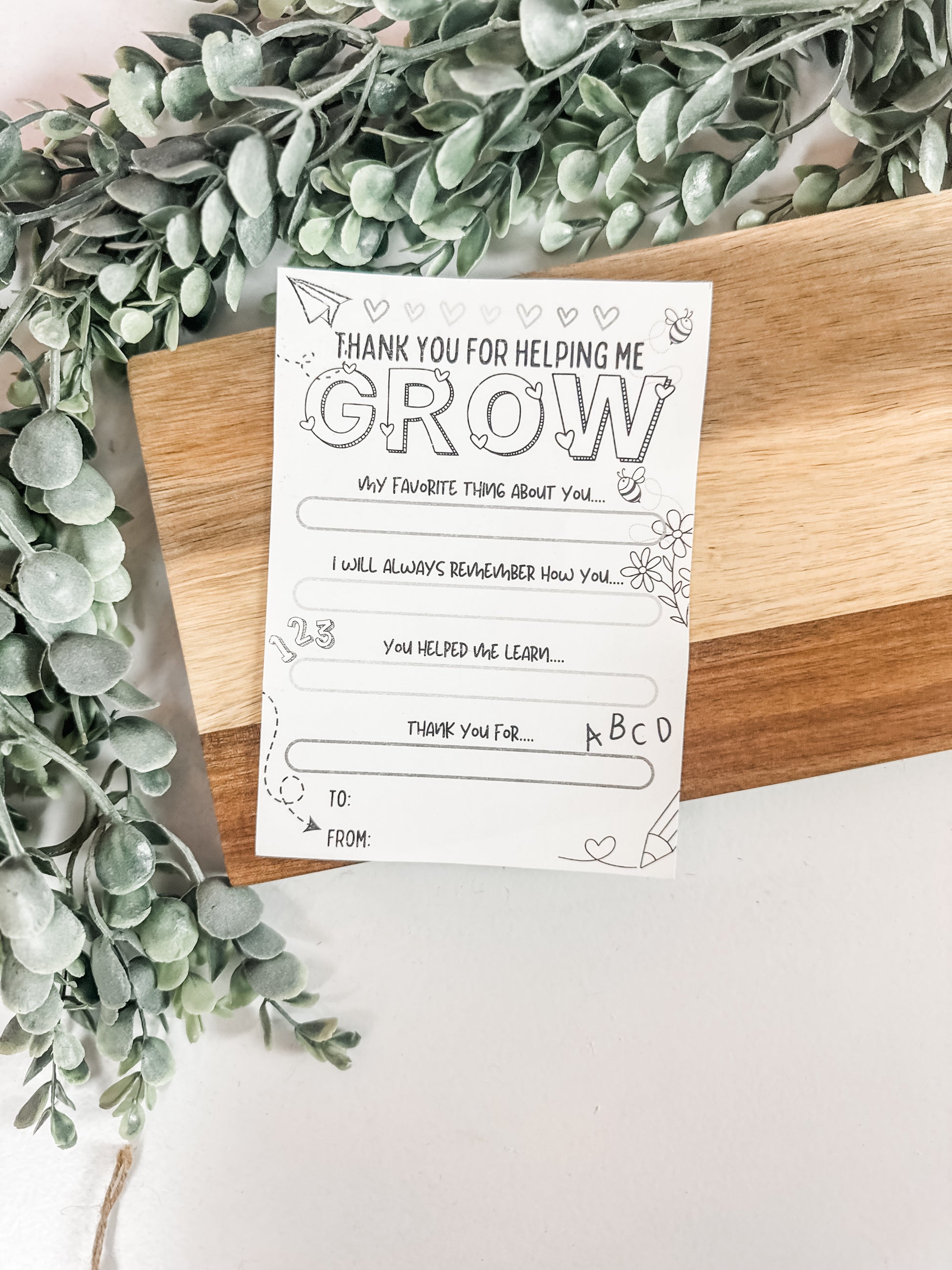 This bundle includes a wooden apple ornament with the words Love • Teach • Inspire and a thank you card for your child to fill out. The ornament makes a lasting keepsake, while the card adds a personal touch, letting kids share their favorite memories and words of thanks.