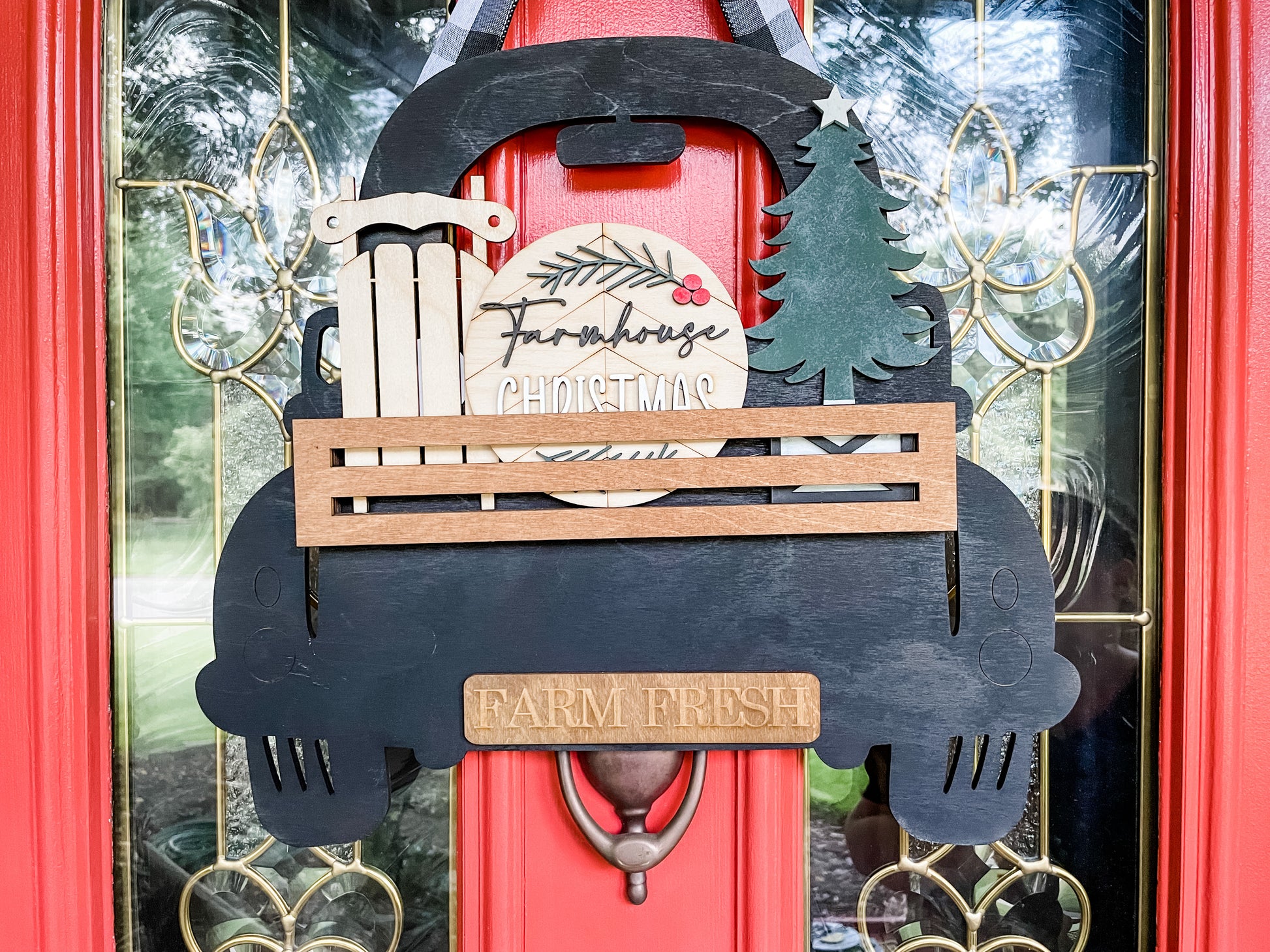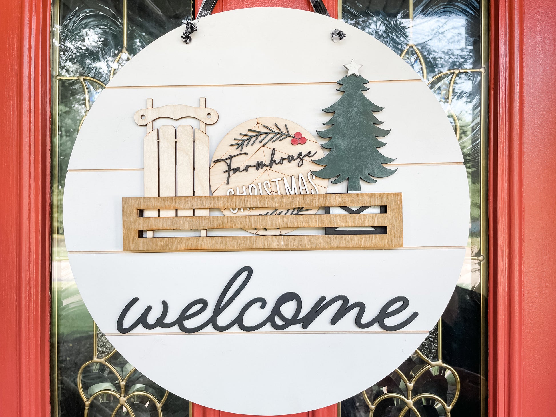 Farmhouse Christmas Sign: A round sign featuring the words "Farmhouse Christmas" surrounded by delicate greenery and holly accents, capturing the essence of a cozy farmhouse Christmas.