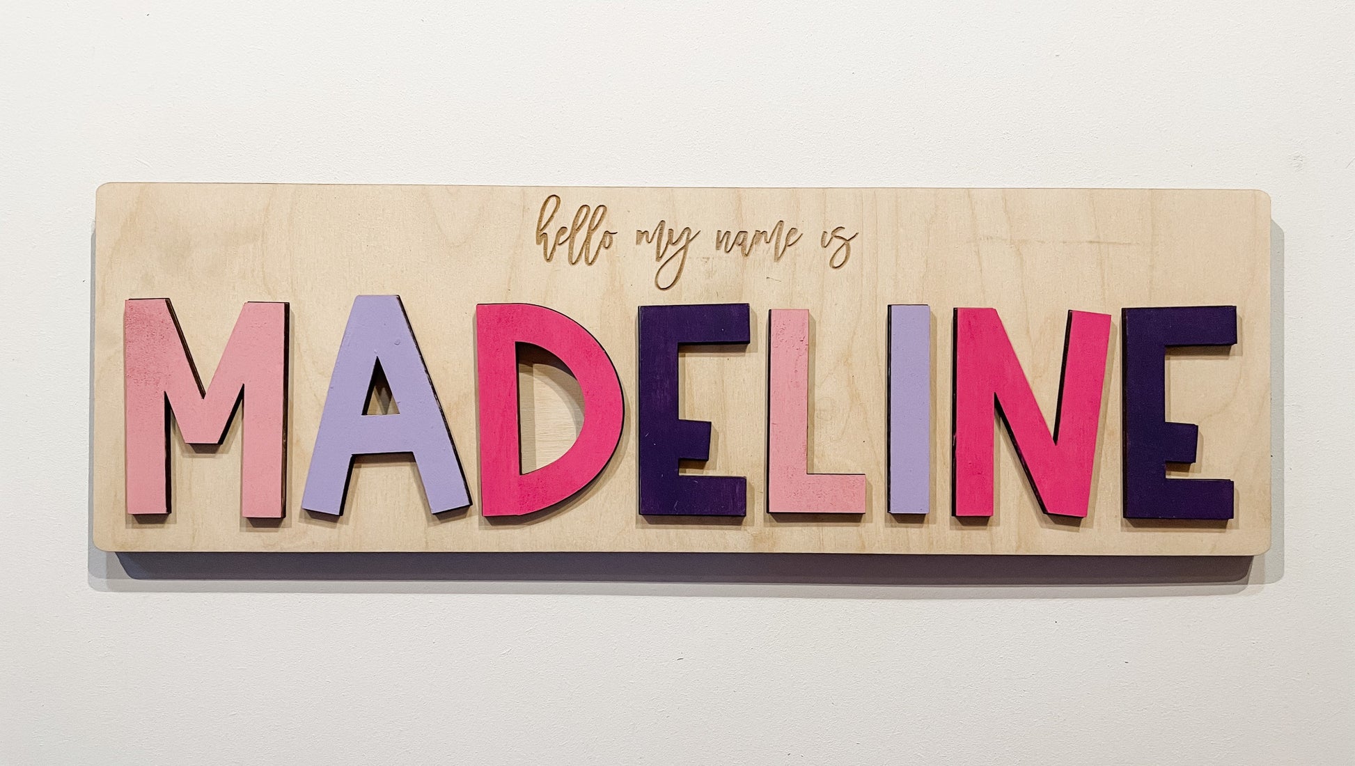 Letters on this board are all uppercase and are raised to make it easy to pick up for little hands. The hello my name is, is engraved on birch. This puzzle is painted with acrylic paint.