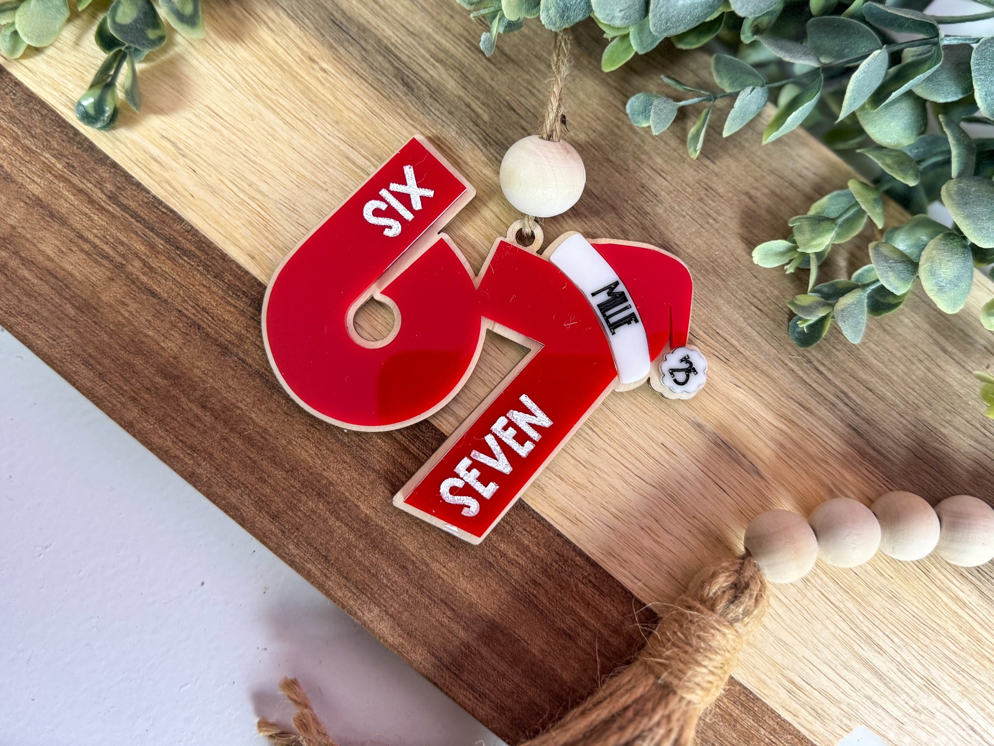 This festive ornament features bold red acrylic numbers with engraved lettering and a personalized Santa hat — perfect for adding a fun, custom touch to your Christmas tree.