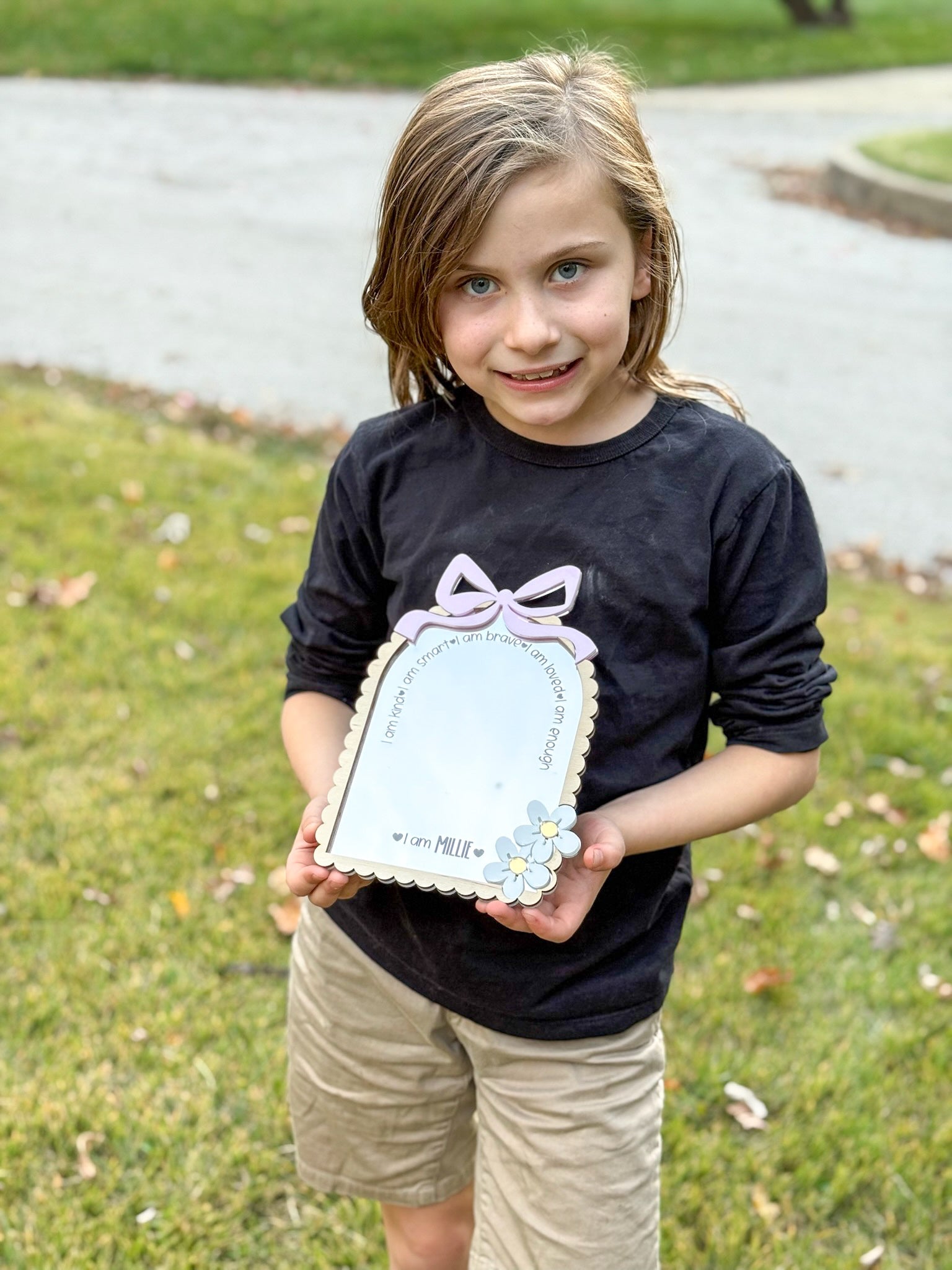 Our Personalized Affirmation Mirror is designed to remind little ones of their worth and strength every time they look in the mirror. Each mirror features a soft, scalloped edge, a sweet bow accent, and an inspiring affirmation that reads:
